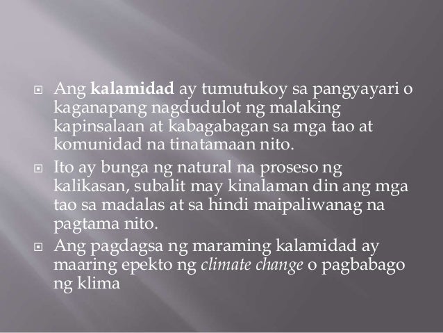 At natatalakay ang ibat ibang uri ng kalamidad na nararanasan sa komunidad at sa bansa gaya ng pagbagyo pagbaha at pagdaluyong-bagyo.